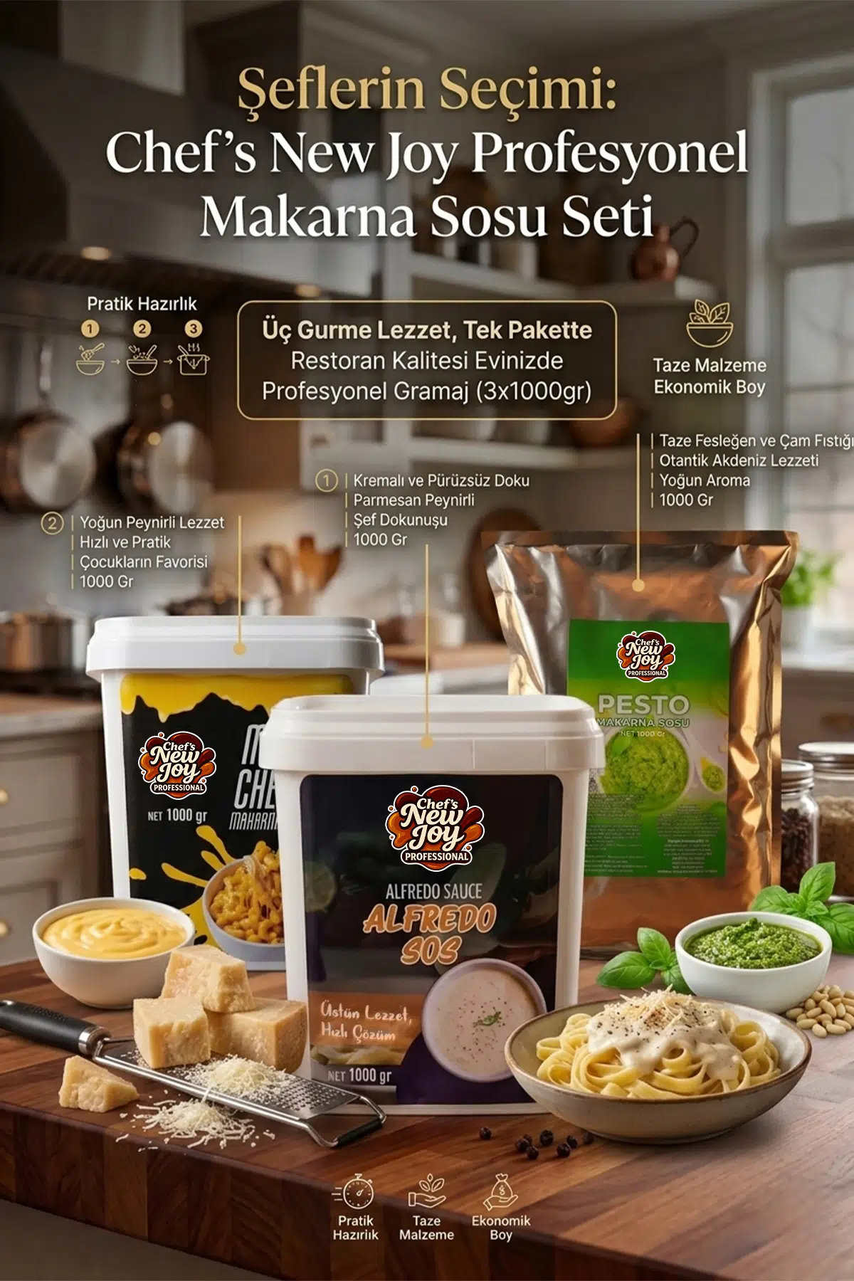 Mutfaktaki yeni neşenizle tanışın! Chef's New Joy kalitesiyle hazırlanan, restoran mutfaklarının sırrını evinize taşıyan en sevilen üçlü bir arada. 1000 gramlık profesyonel gramajları ile hem bereketli hem de kusursuz lezzet arayanlar için tasarlandı.