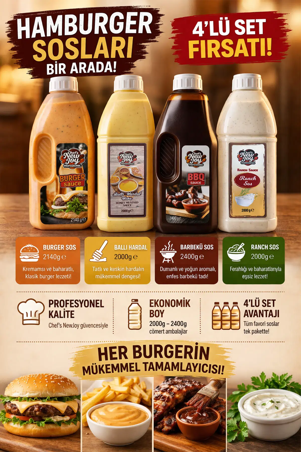 Mutfaklarda gerçek bir lezzet devrimi başlıyor! Chef's New Joy kalitesiyle, en çok tercih edilen 4 efsane sosu profesyonel mutfak gramajlarıyla tek pakette topladık. Burgerleriniz, patatesleriniz ve tüm atıştırmalıklarınız artık şef elinden çıkmış gibi kusursuz olacak.