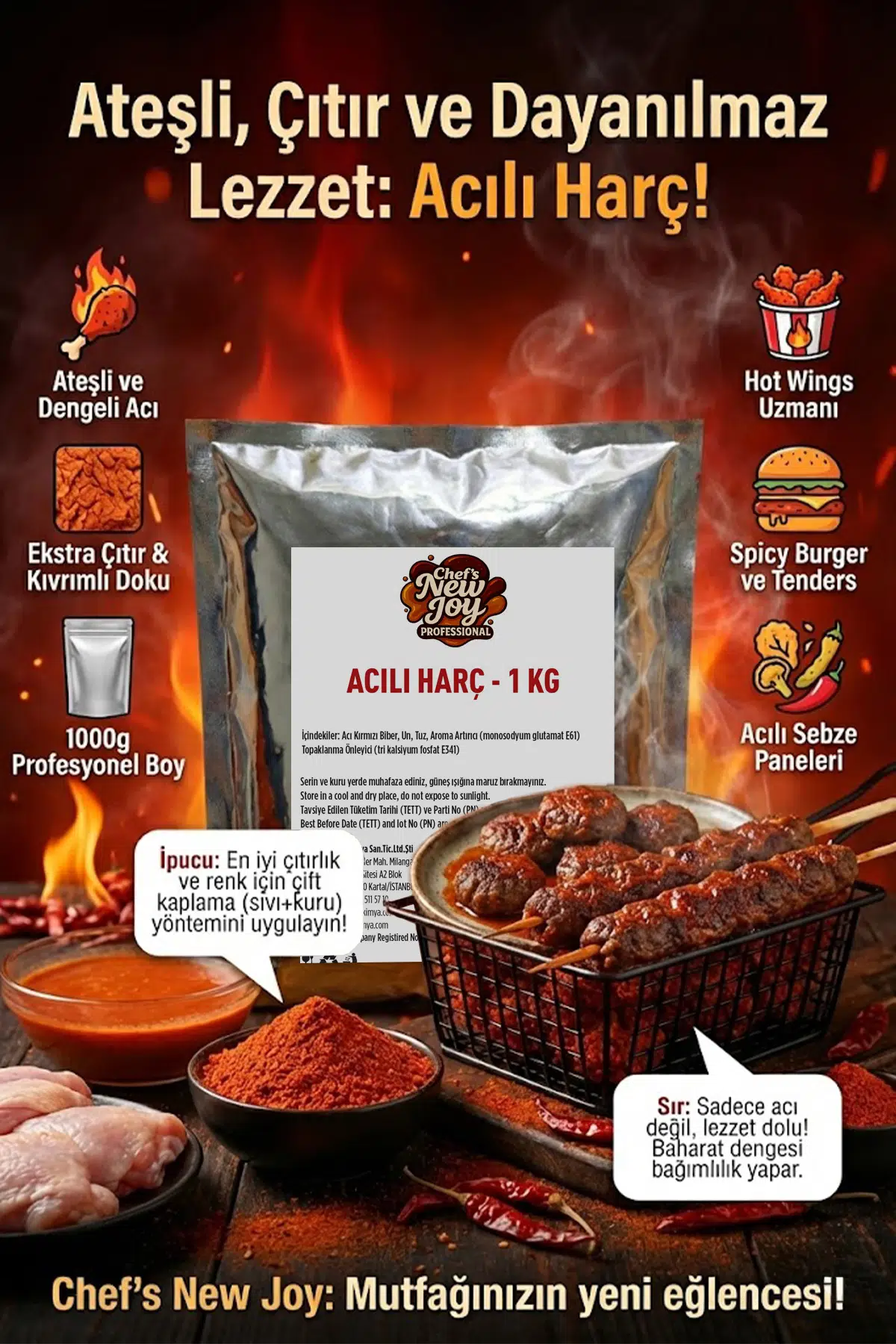 Acı severlerin aradığı o mükemmel dengeyi ve "çıtırtıyı" tek pakette sunuyoruz! Chef's New Joy Acılı Harç, özenle seçilmiş acı biberler ve baharatların harmanlanmasıyla, kızartmalarınıza hem cesur bir acılık hem de iştah açıcı kızıl bir renk katmak için tasarlandı.