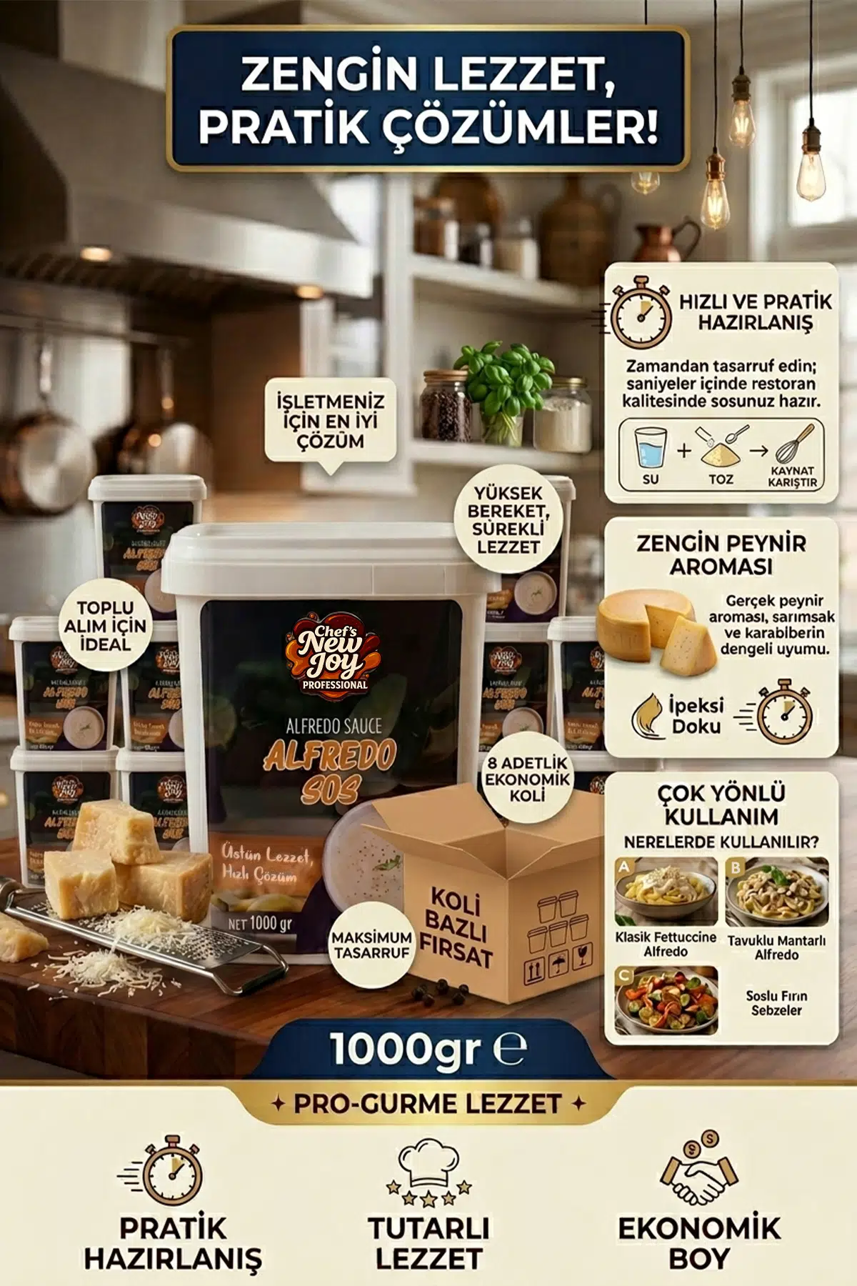 Dünya mutfağının en sevilen soslarından biri olan Alfredo, Chef's New Joy uzmanlığıyla işletmeniz için çok daha pratik ve ekonomik. Gerçek parmesan peyniri aroması, karabiber ve sarımsağın dengeli uyumuyla hazırlanan bu toz karışım, şimdi 8 adetlik ekonomik koli seçeneğiyle mutfak operasyonlarınızı hızlandırmaya hazır.