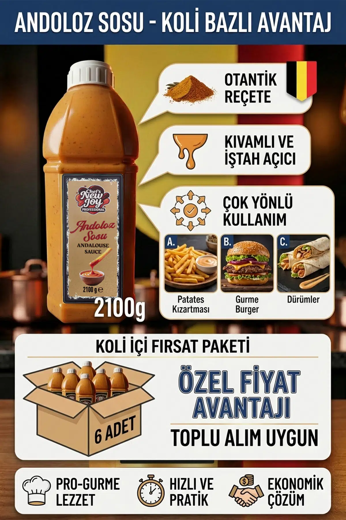Chef's New Joy Andalouse Sos, mayonez, domates salçası ve özenle seçilmiş baharatların (genellikle hafif acı biber ve soğan) mükemmel uyumuyla hazırlanan, dumanlı ve iştah açıcı bir sos deneyimi sunar. Restoranlar, kafeler, büfeler ve yoğun mutfaklar için 6 adetlik ekonomik koli seçeneğiyle maliyetlerinizi düşürün, lezzeti sabitleyin!