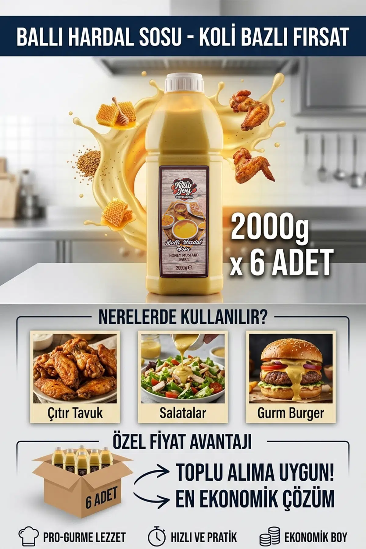 Chef's New Joy Ballı Hardal Sos, hardalın karakteristik keskinliğini gerçek balın yumuşak tatlılığıyla birleştiren, gurme mutfakların vazgeçilmez bir tamamlayıcısıdır. Profesyonel mutfaklar için hazırlanan 6 adetlik ekonomik koli seçeneğiyle hem stoklarınızı güvenceye alın hem de birim maliyetlerinizi düşürün!