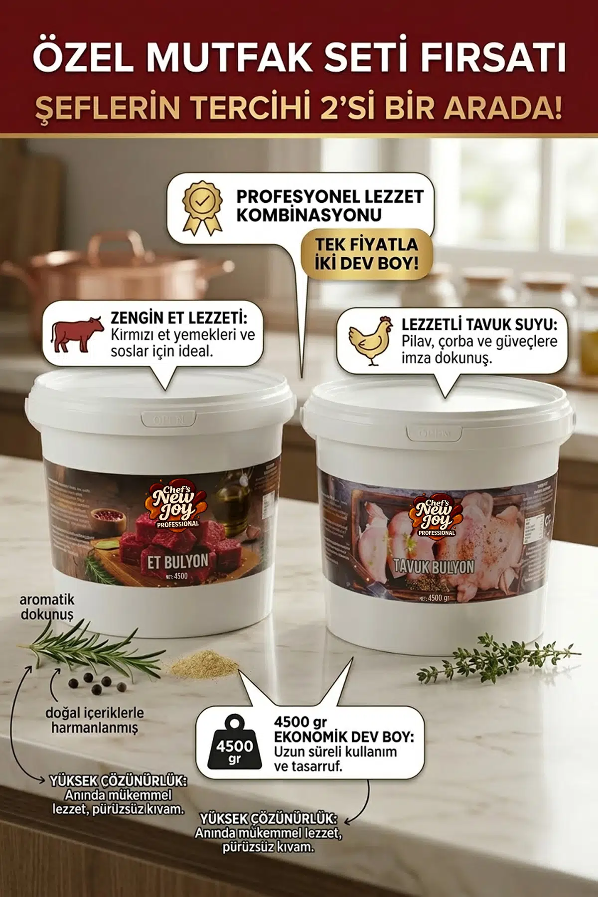 Profesyonel mutfakların vazgeçilmezi Chef's New Joy lezzeti şimdi en ekonomik haliyle sizlerle. Yemeklerinize altın dokunuşu yapan Tavuk Bulyon ve derinlik katan Et Bulyon, toplamda 9 kilogramlık dev avantaj paketiyle tek fiyata!