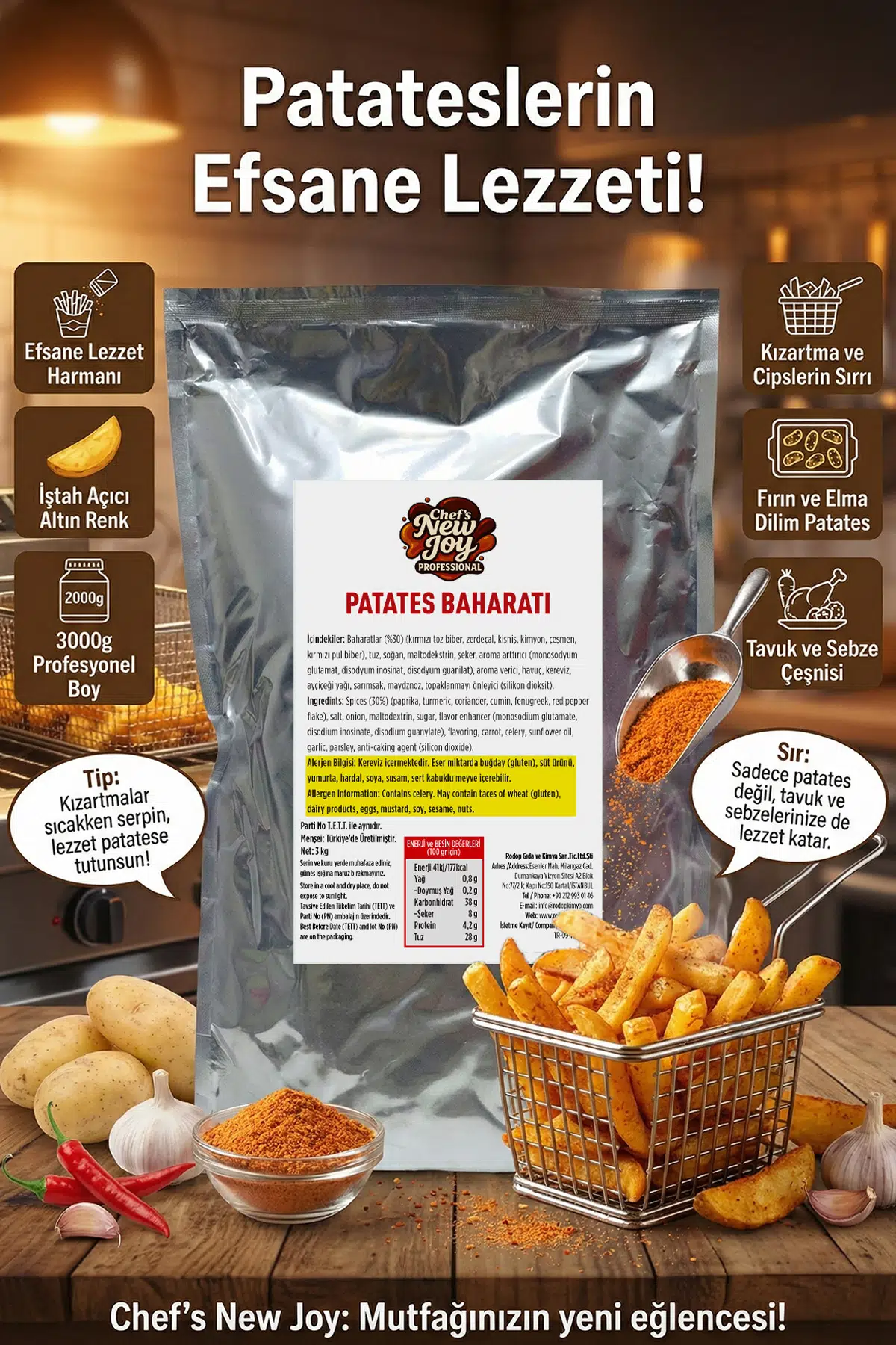 En sevilen garnitür olan patates kızartmasını sıradanlıktan çıkarıp bir imza lezzete dönüştürmeye hazır mısınız? Chef’s New Joy Patates Baharatı, geniş hacimli mutfaklar için özel olarak formüle edilmiş, her kullanımda aynı yüksek lezzet standardını garanti eden profesyonel bir karışımdır.