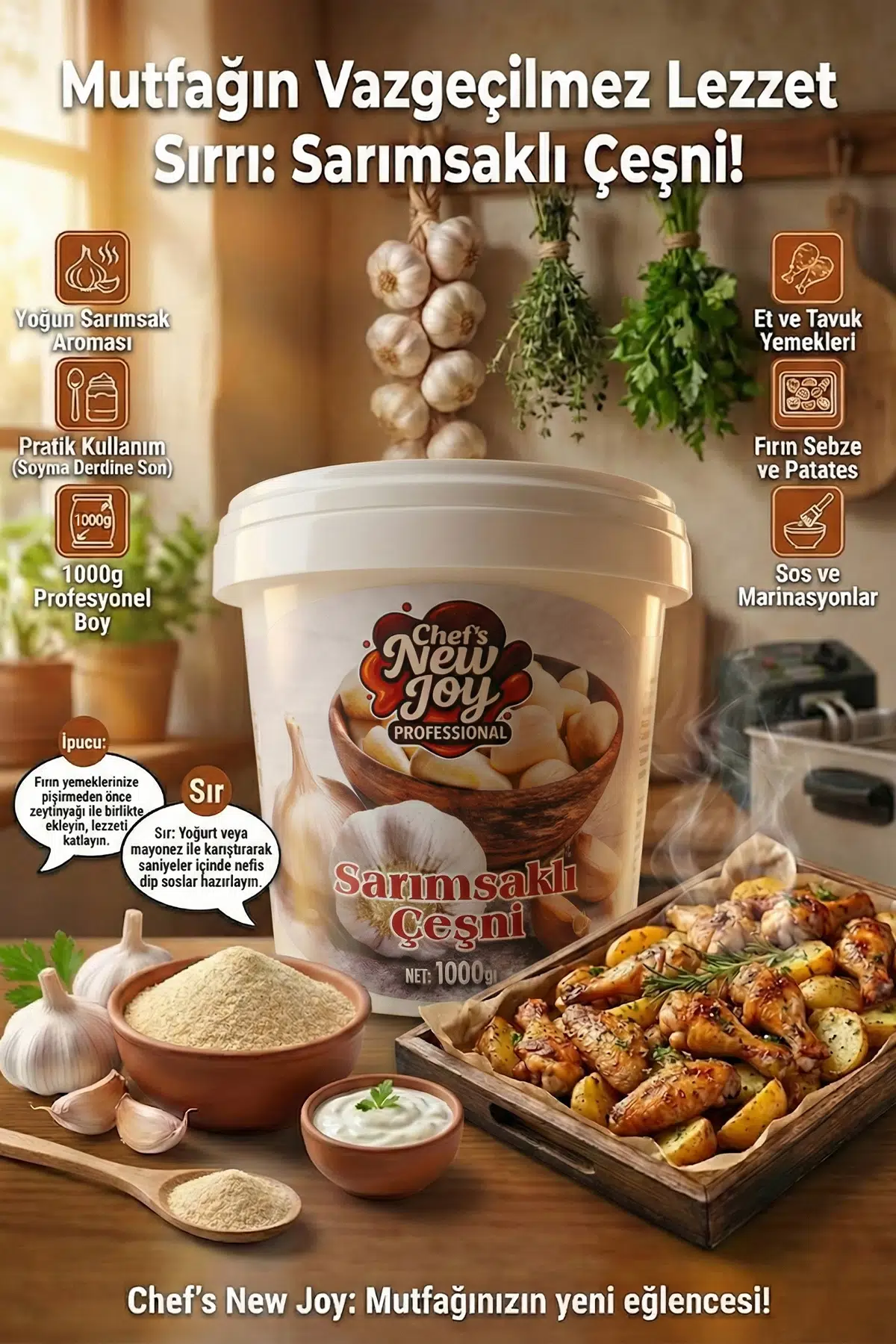 Taze sarımsağın o eşsiz aromasını, soyma ve doğrama zahmetine girmeden dilediğiniz an yemeklerinize ekleyin! Chef's New Joy Sarımsaklı Çeşni, özenle seçilmiş sarımsakların kurutulup öğütülmesiyle elde edilen, yoğun ve doğal lezzeti en pratik haliyle sunar.