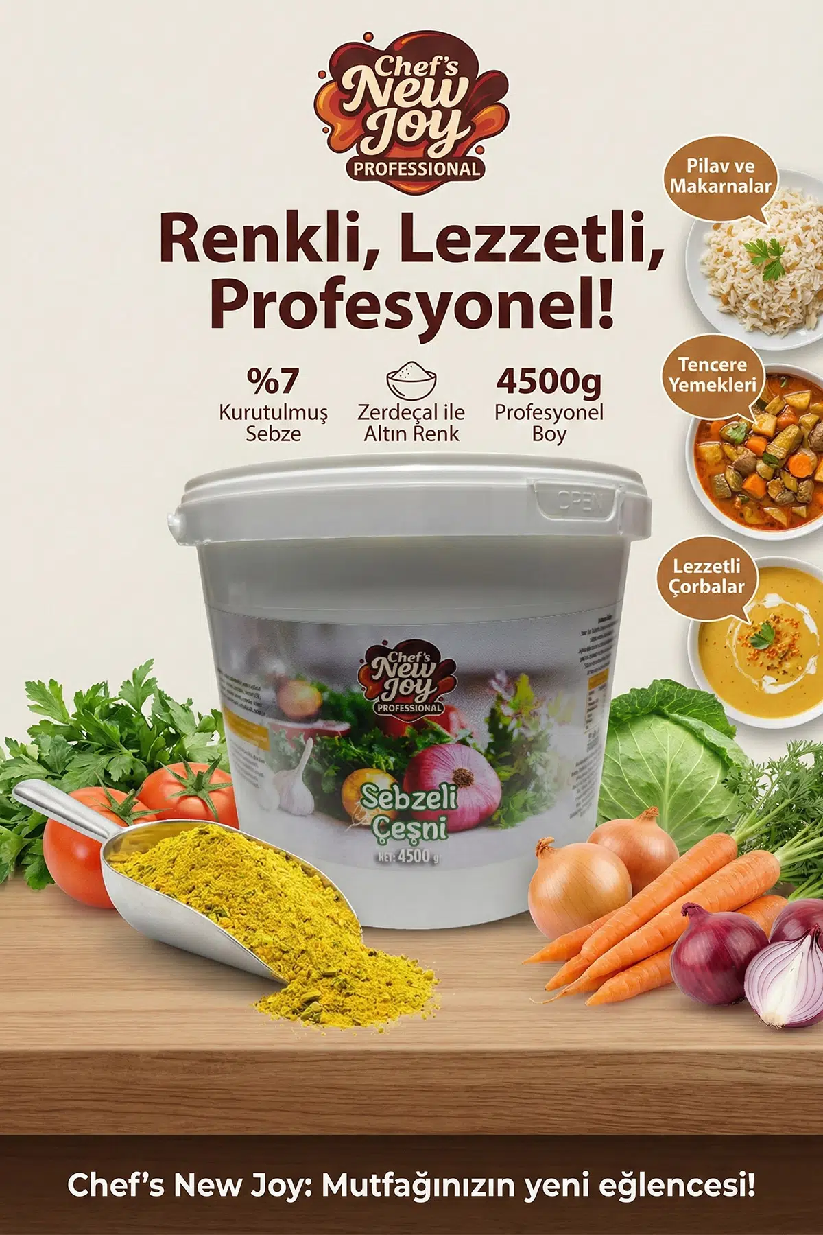 Yemeklerinize tek bir dokunuşla hem renk hem de derin bir lezzet katmak ister misiniz? Chef's New Joy Sebzeli Çeşni, özenle seçilip kurutulmuş 7 farklı sebzenin (havuç, soğan, maydanoz, kereviz, sarımsak, kırmızı biber) ve şifalı zerdeçalın mükemmel uyumudur.