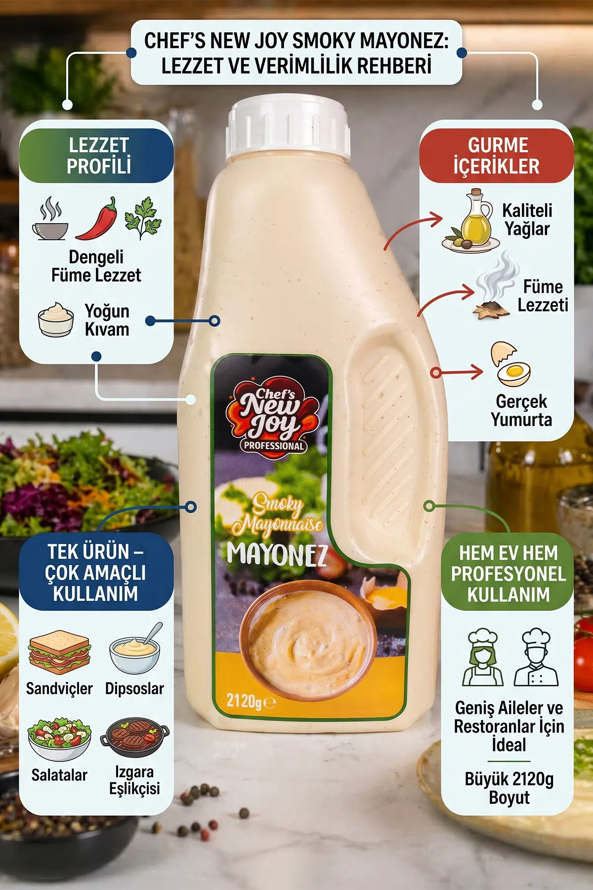 Gurme tabakların, dumanı tüten burgerlerin ve imza sandviçlerin gizli kahramanıyla tanışın. Chef’s New Joy Smoky Mayonez, klasik mayonez dokusunu, özenle dengelenmiş doğal tütsü (smoke) aromasıyla birleştirerek mutfağınıza modern bir dokunuş getiriyor. 2120 gramlık dev boyuyla profesyonel mutfaklar (Horeca) için yüksek verimlilik ve standart lezzet sunar.