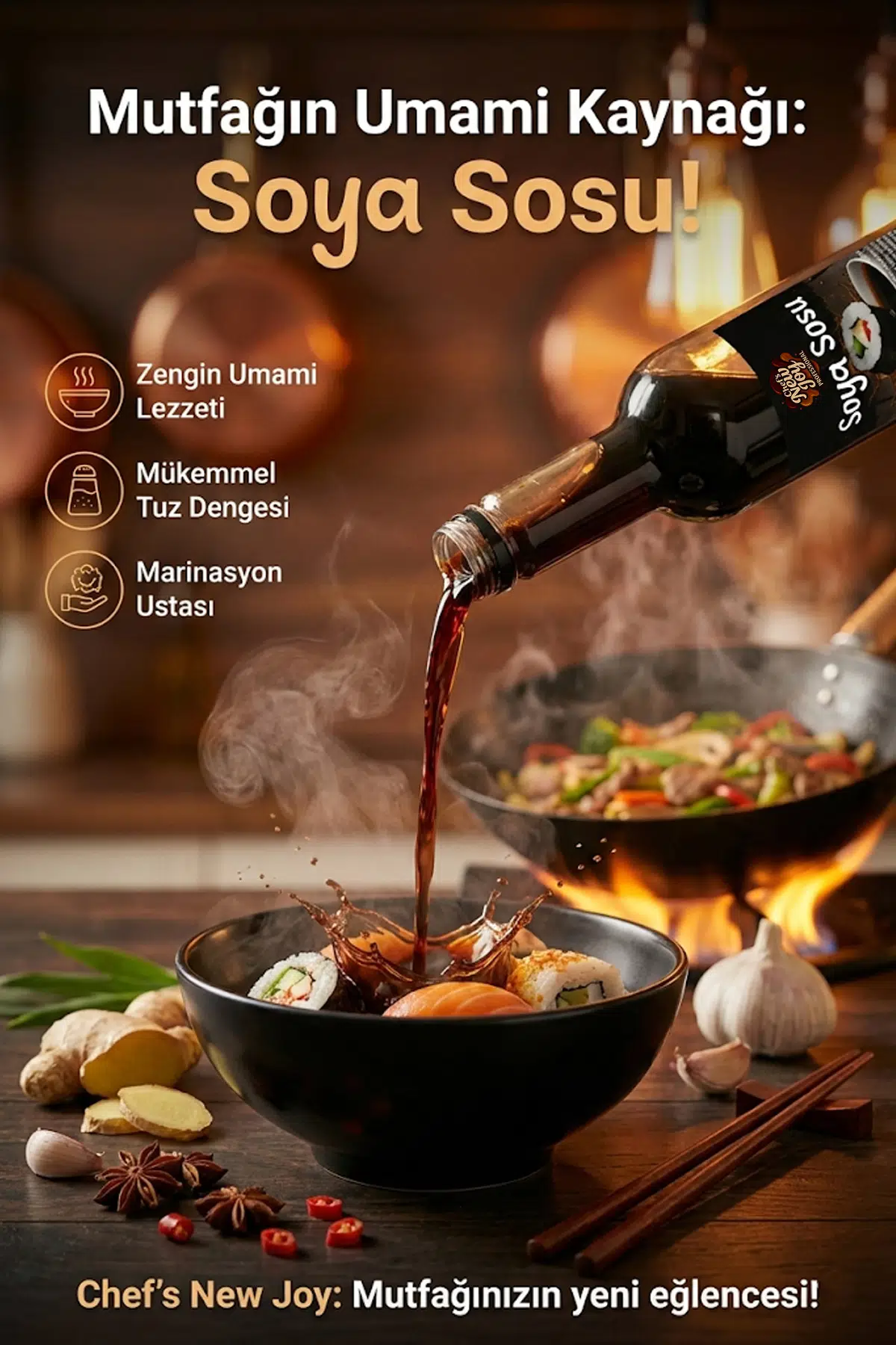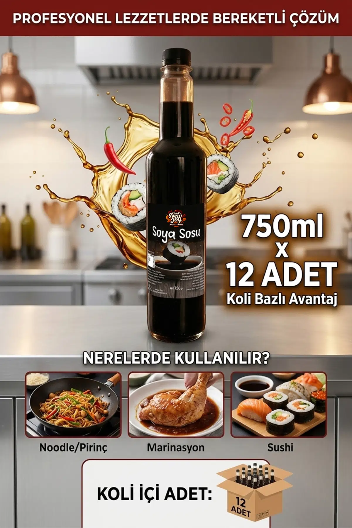 Chef's New Joy Soya Sosu, Uzak Doğu mutfağının o kendine has, derin ve iştah açıcı lezzetini en saf haliyle sunar. Şimdi restoranlar, oteller ve yoğun mutfaklar için 12’li koli avantajıyla satışta!