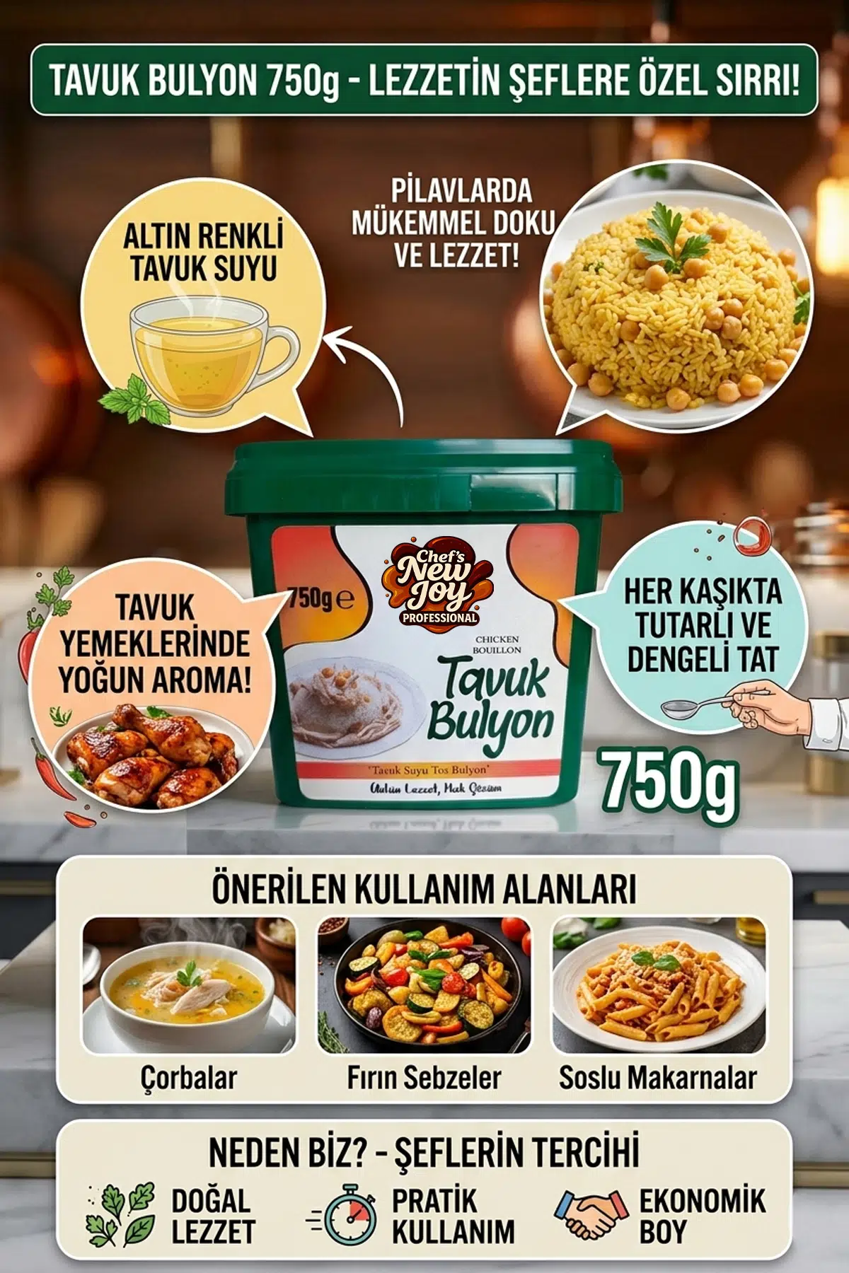 Mutfağınızdaki yemeklerin gizli kahramanıyla tanışın! Chef's New Joy Tavuk Bulyon, en seçkin tavuk aromalarının dengeli bir karışımıyla hazırlandı. Toz formu sayesinde klasik küp bulyonların aksine yemeğinize tam istediğiniz miktarda dozajlama yapmanıza olanak tanır, topaklanma yapmadan anında çözünür.